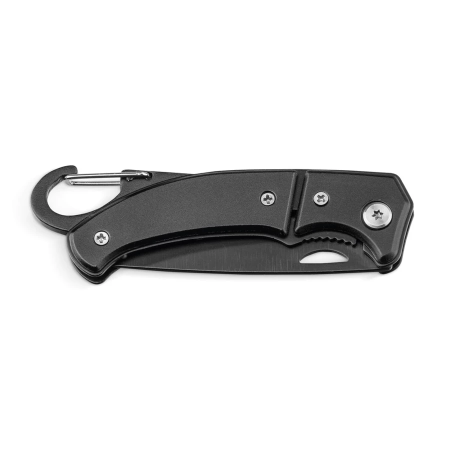 Aluminum pocket knife, stainless steel blade with safety clasp and carabiner. Supplied in a gift box. 101 x 10 x 29 mm | Box: 108 x 39 x 15 mm