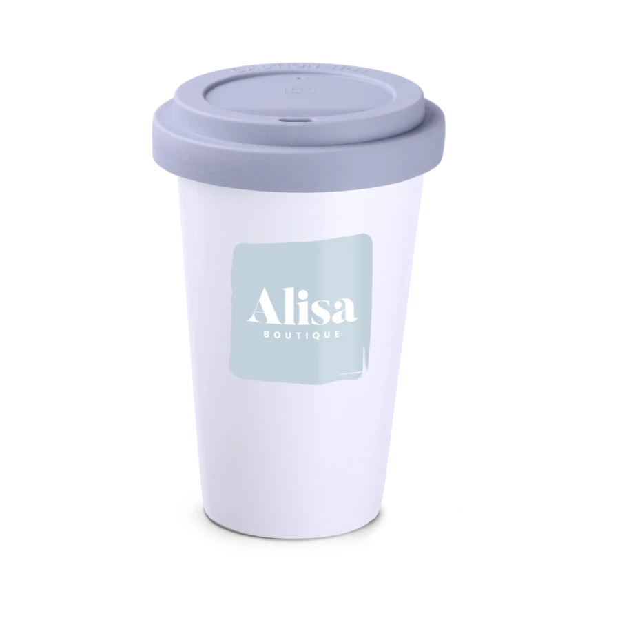 Porcelain advertising mug with a polymer cover that protects against accidental spilling of the drink. The model is intended for active people, lovers of trips and travel. Thanks to the rare internal structure of double porcelain walls, this mug is characterized by an increased level of thermal insulation. The cover is available in several colors.