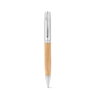 Ball pen with case in bamboo and aluminium with metallic matte finishing. Features a twist mechanism and a metal clip. Black ink. As the product is made from natural materials, the colour and the printing result may vary between products. Ball pen: Ø12 x 136mm | Case: 23 x 155 mm