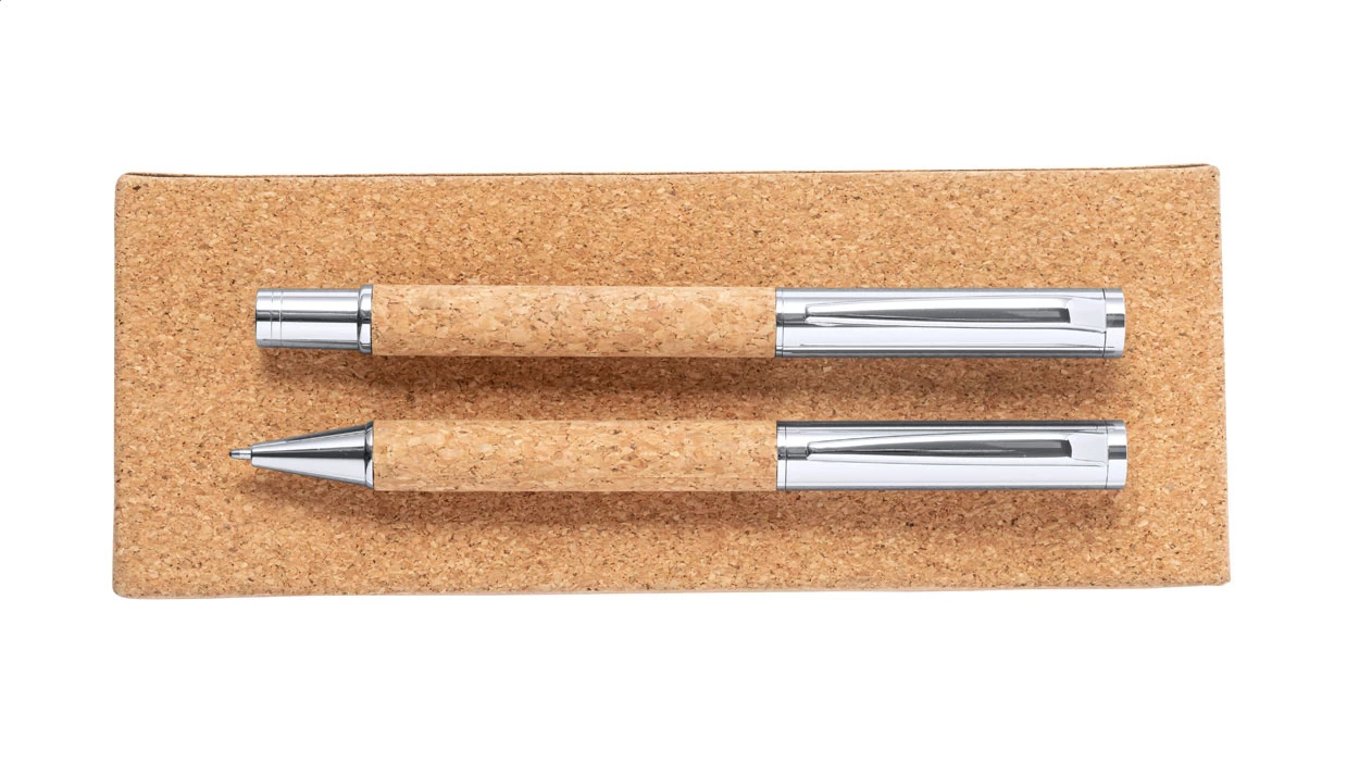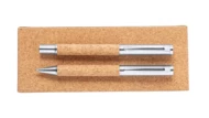 Elegant, metal ballpoint and roller pen set with natural cork covered barrel. In natural cork gift box, with blue refill.