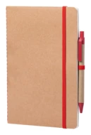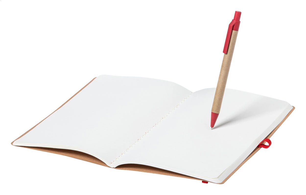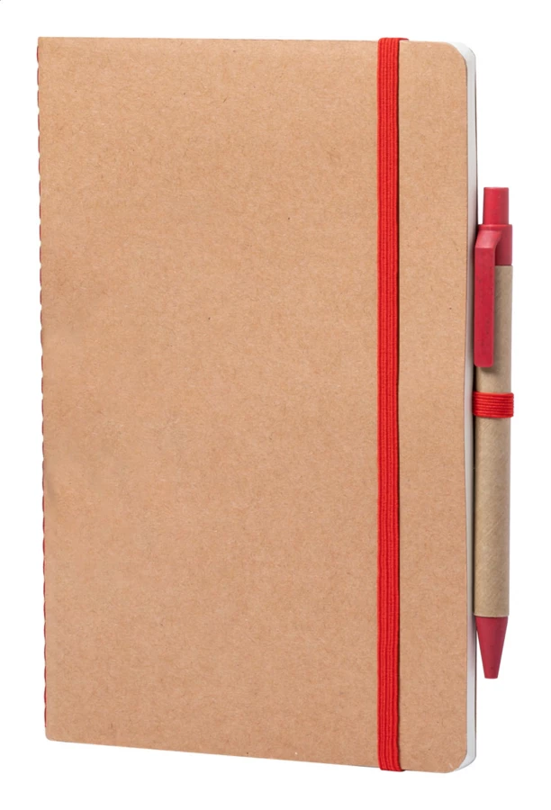 Recycled cardboard covered notebook with 60 blank sheets and coloured rubber strap, A5 size. Including wheat straw plastic ballpoint pen with blue refill.