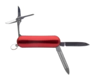 Mini, stainless steel pocket knife with 3 functions and aluminium handle.