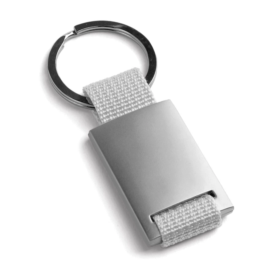 Metal and webbing keyring. Available in a wide range of colours. Supplied in a kraft paper gift box. Ring: ø 35 mm | Product: 60 x 28 x 6 mm | Total: 87 x 35 x 6 mm | Box: 85 x 45 x 13 mm