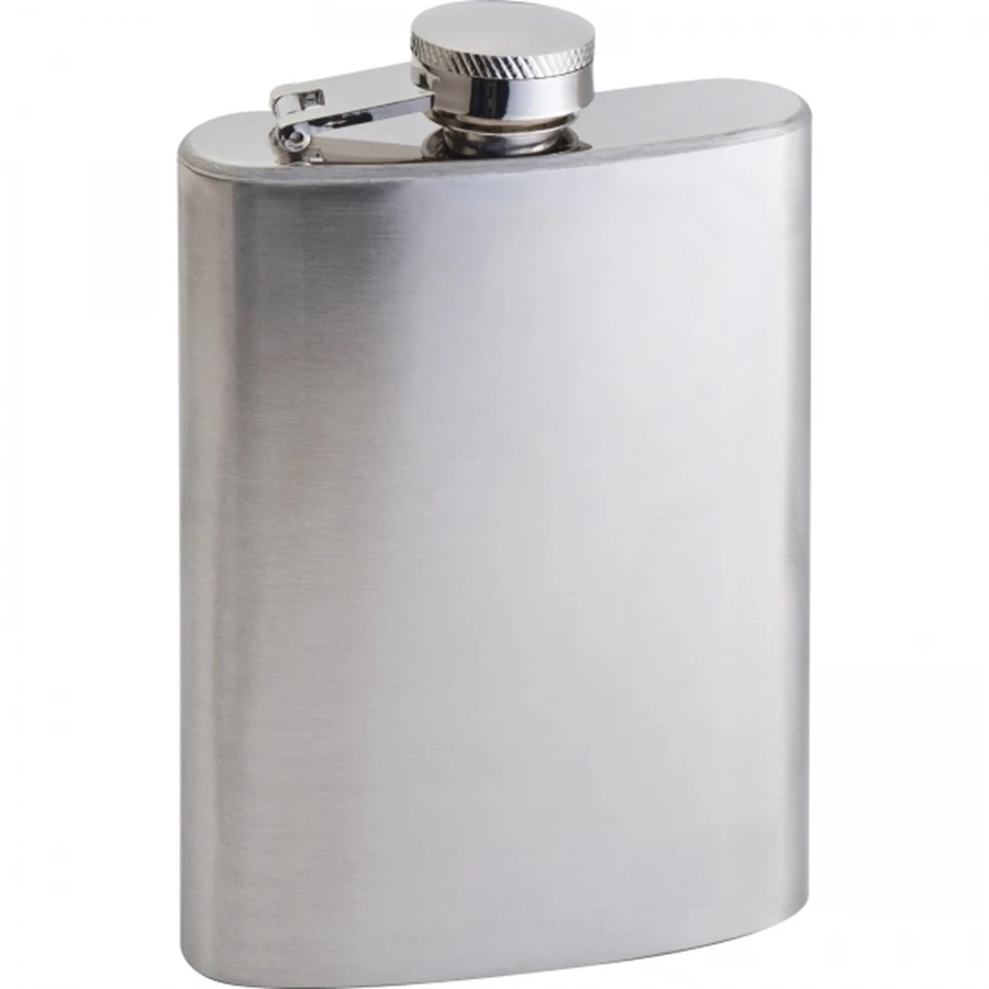 Stainless steel hip flask with a security screw cap and 104 ml content.