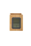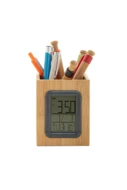 Bamboo pen holder with multifunctional digital clock. Functions: alarm clock, calendar and thermometer. With button cell battery.