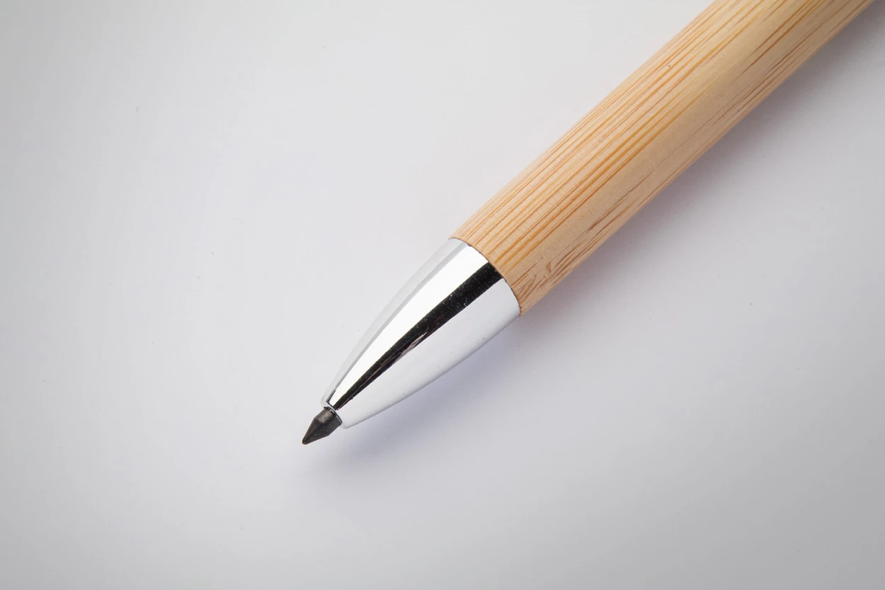 Bamboo inkless pen with metal parts. With metal alloy tip, which oxidizes the paper. This pen writes similarly to a pencil, and it is also erasable.