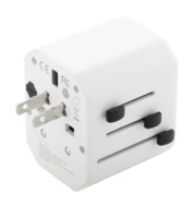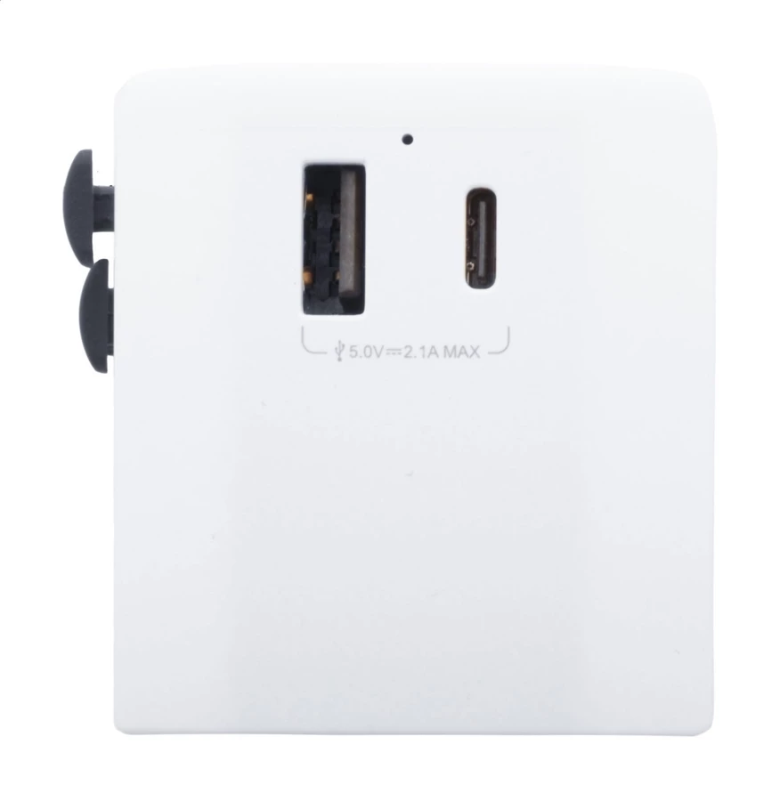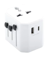 Universal world-wide travel adapter in ABS plastic, with built-in wall plugs for USA, Europe, UK and Australia. With 1 USB and 1 USB-C charger ports.