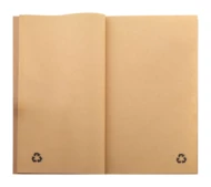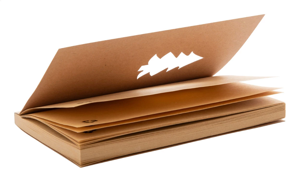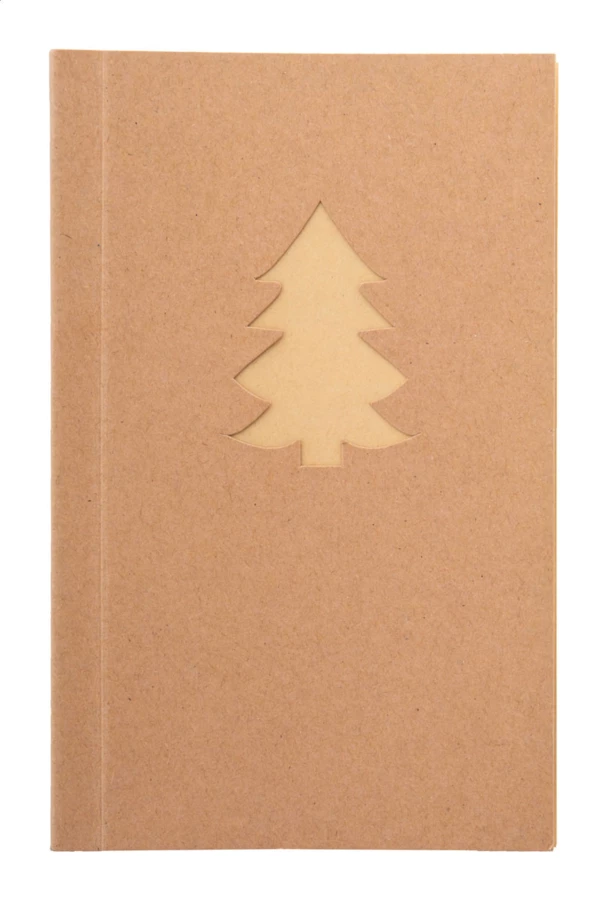 Recycled paper covered notebook with die-cut Christmas tree on the cover and 85 blank sheets in recycled kraft paper.