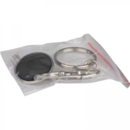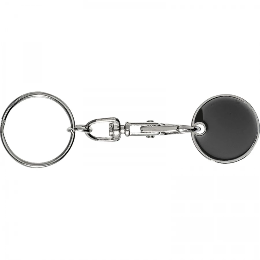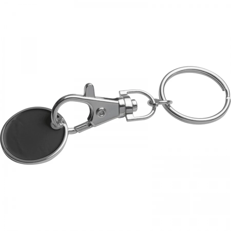 Metal keyring with snap hook and shopping coin. We will engrave your logo on the silver side of the coin.