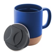 High quality ceramic mug with natural cork base and PP plastic drinking lid. With matte outside and glossy inside finish. 325 ml. In kraft paper box.