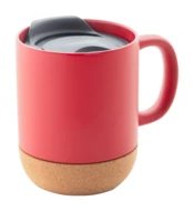 High quality ceramic mug with natural cork base and PP plastic drinking lid. With matte outside and glossy inside finish. 325 ml. In kraft paper box.