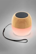 Wireless speaker in recycled ABS plastic and bamboo housing with multicolour LED light at the bottom. With carry strap and built-in rechargeable battery. Including USB charger cable.
