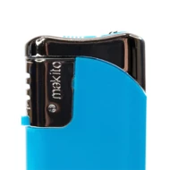 Gas lighter with electric mechanism. With child protection, refillable, flame regulator and available in a wide range of solid colours. Supplied in boxes of 50 units of the same color.