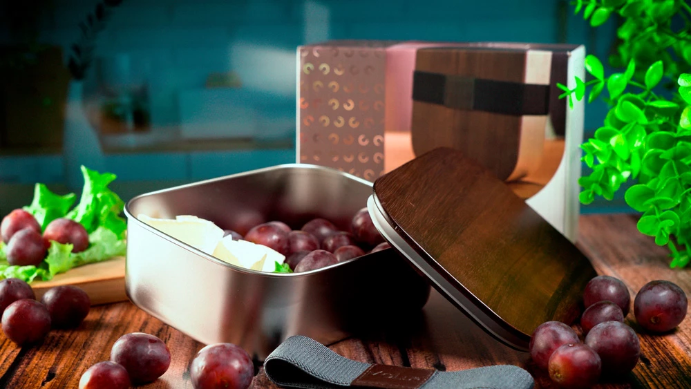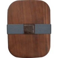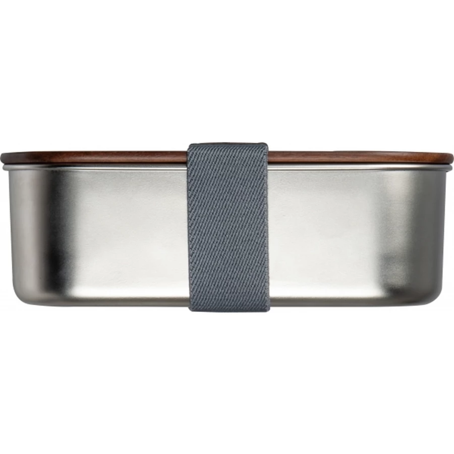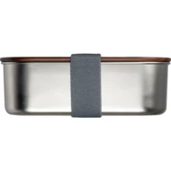 Lunch box made of recycled stainless steel, with an acacia wood lid and elastic band. Capacity 1000 ml.