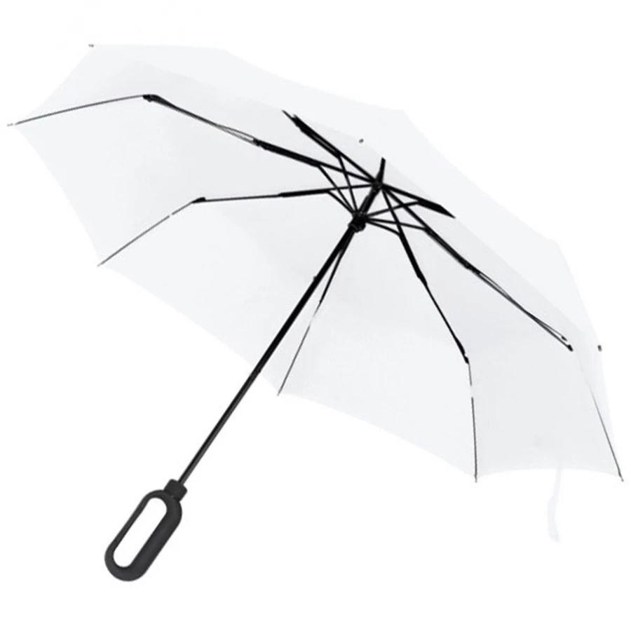 Elegant pocket umbrella with rubberized carabiner handle. We print your logo on a segment.