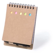 Sticky ring notepad with recycled cardboard ball pen included. With soft-touch covers in resistant rigid recycled cardboard with die-cut. With 50-sheet single-stripe book, 15 large sticky notes and 75 mini sticky notes. Ball pen with blue ink.