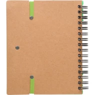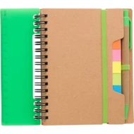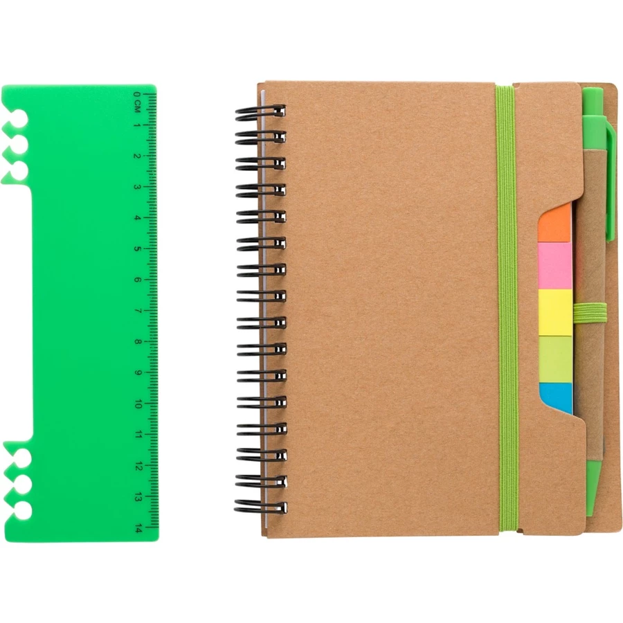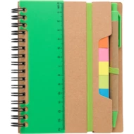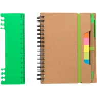 Memo holder, notebook (60 sheets of recycled, lined paper), ball pen, ruler, 125 sticky notes (25 pcs per colour), spiral binding