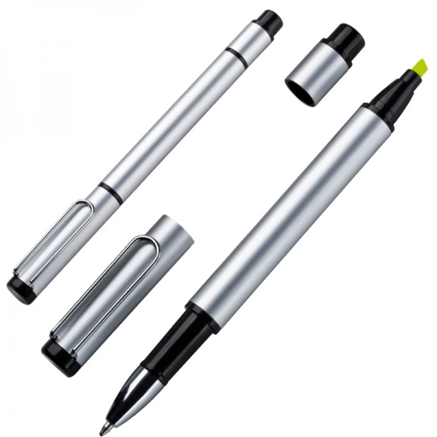 Aluminum ballpoint pen with black-writing refill and yellow highlighter on the opposite side. We engrave your logo on the shaft.