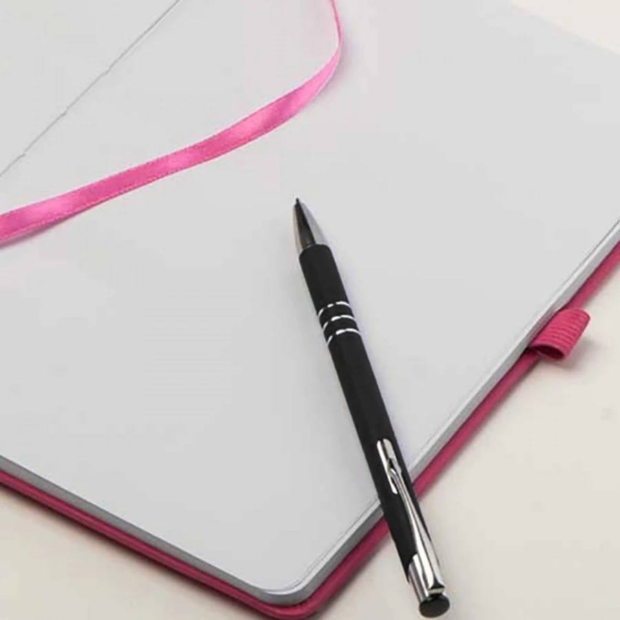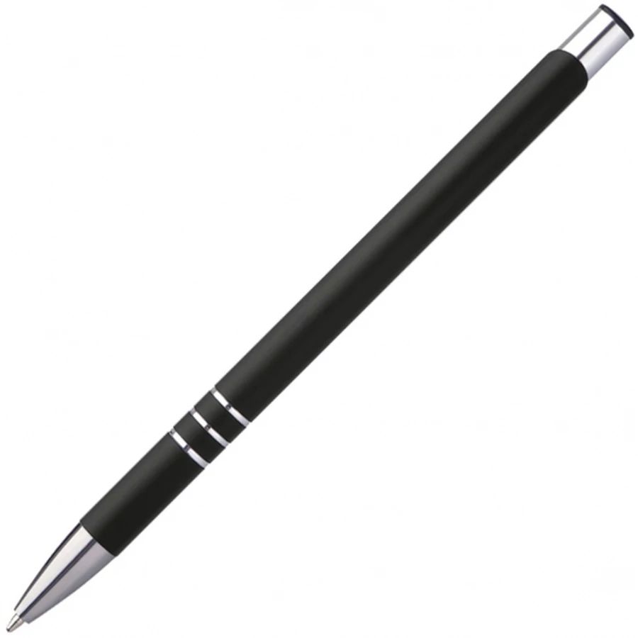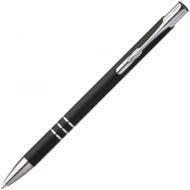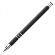 Slim metal ballpen with rubber finish and blue writing plastic refill. Your logo will be engraved below the clip.