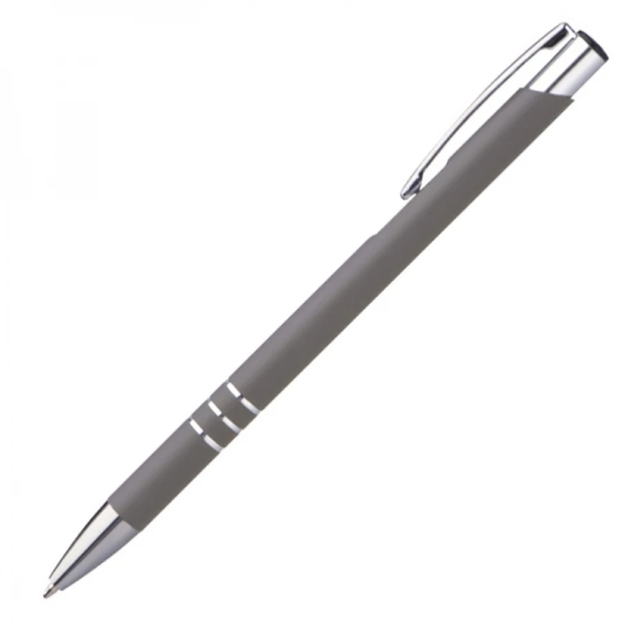 Slim metal ballpen with rubber finish and blue writing plastic refill. Your logo will be engraved below the clip.