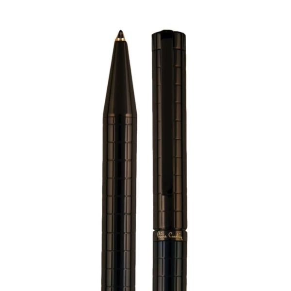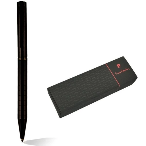 Branded metal ballpoint pen Pierre Cardin with a rotary mechanism. Body is decorated with checkered engraving, contains a quality blue refill, the tip 1 mm and a spare black refill. Packaged in luxury box Pierre Cardin, comes with certificate of authenticity.