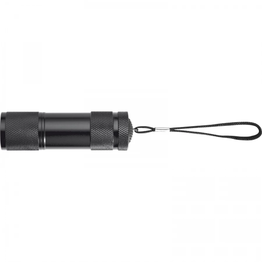 Very bright torch made of aluminum with 9 LEDs and practical hand lug. Supplied inclusive batteries in a box. Will be laser-engraved on the smooth middle part.