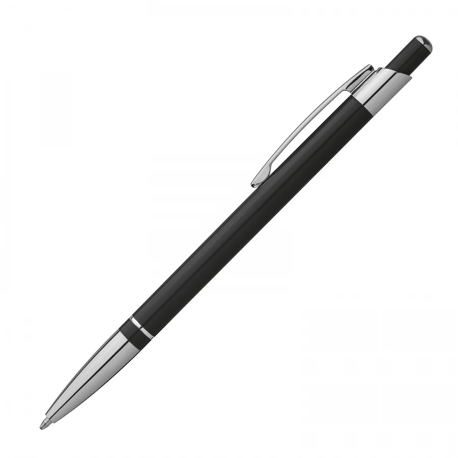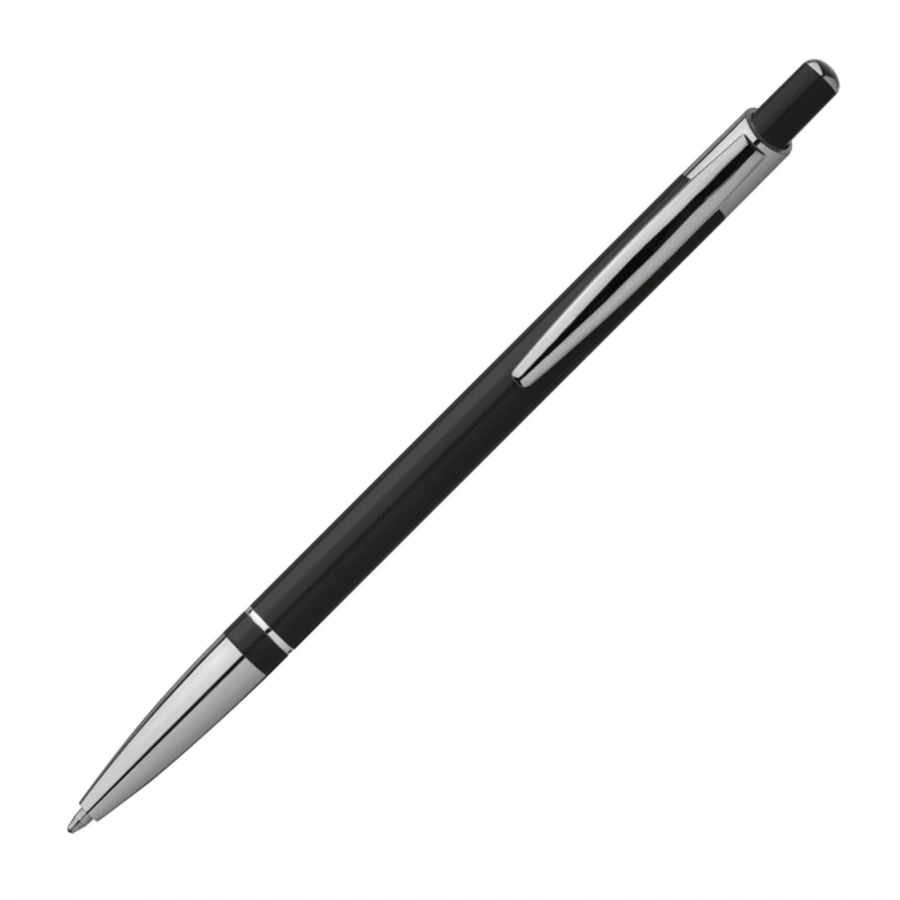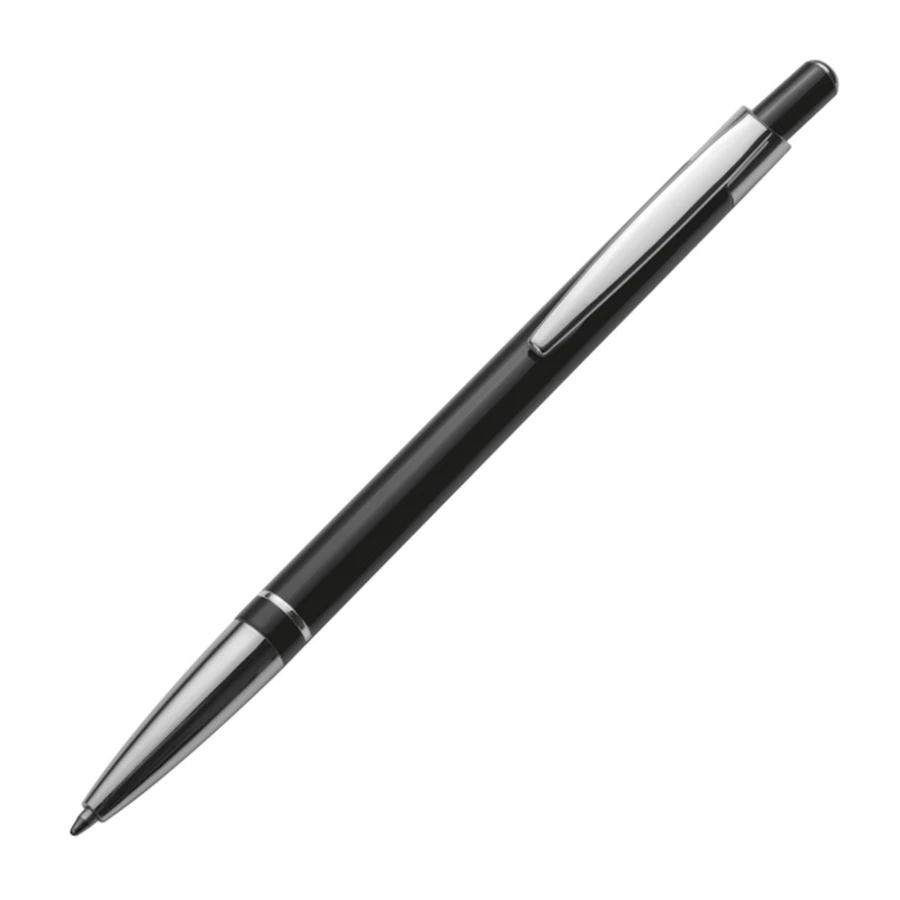Slim aluminium ball pen with blue writing refill. Your logo will be laser engraved below the clip.