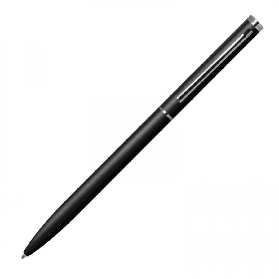 Elegant metal ball pen in slim shape with chromed clip and blue-writing rotary refill.