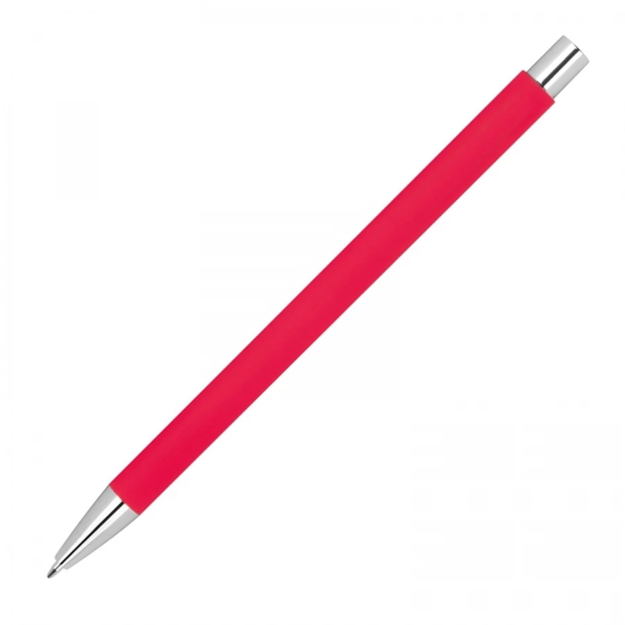 Slim metal retractable ball pen with silver applications, soft touch surface and blue-writing refill.