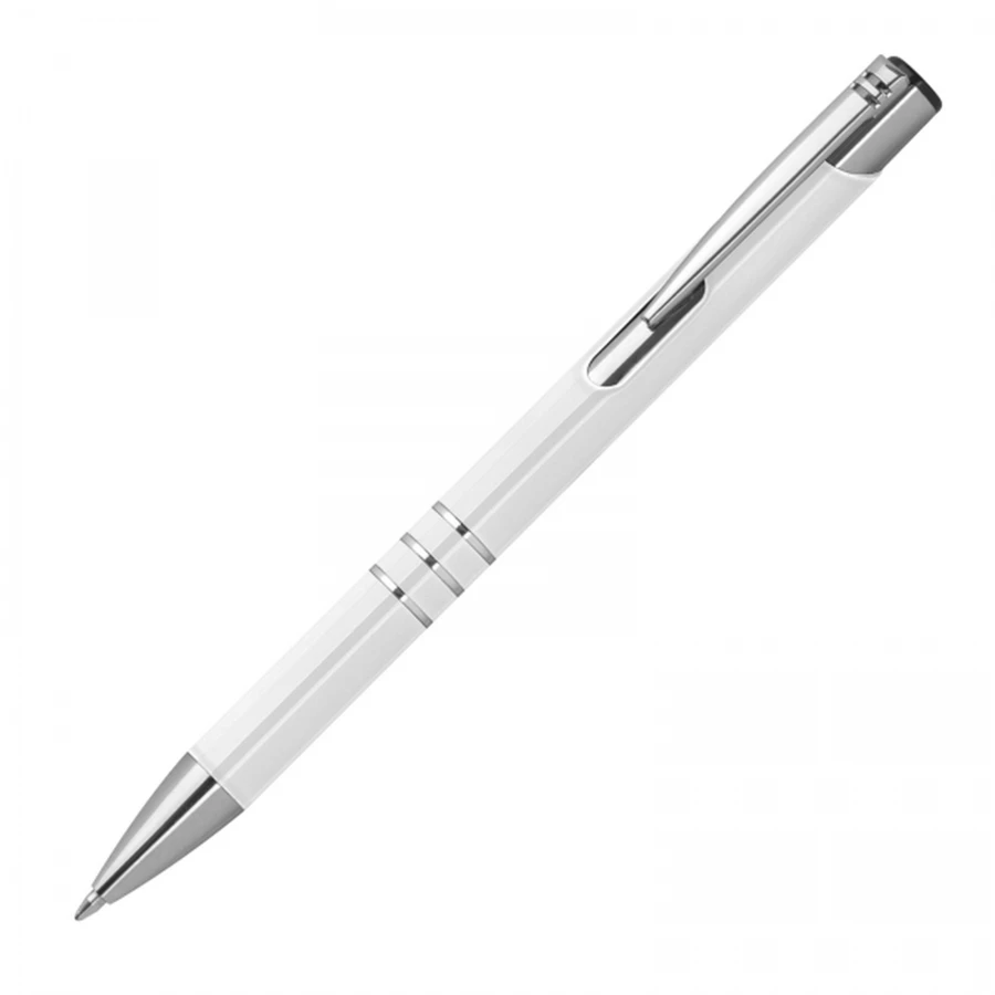 Fully lacquered metal ball pen with 3 decorative rings and blue writing refill with large capacity.