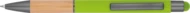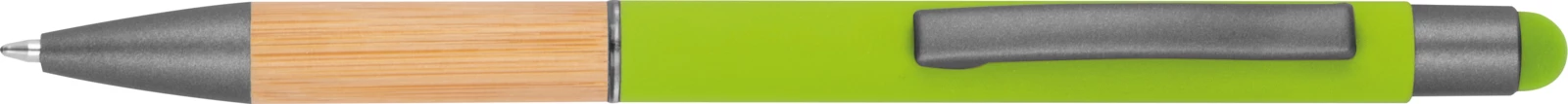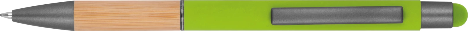 Ball pen made of aluminum with blue-writing refill, touch function, matte silver applications and a bamboo grip zone.