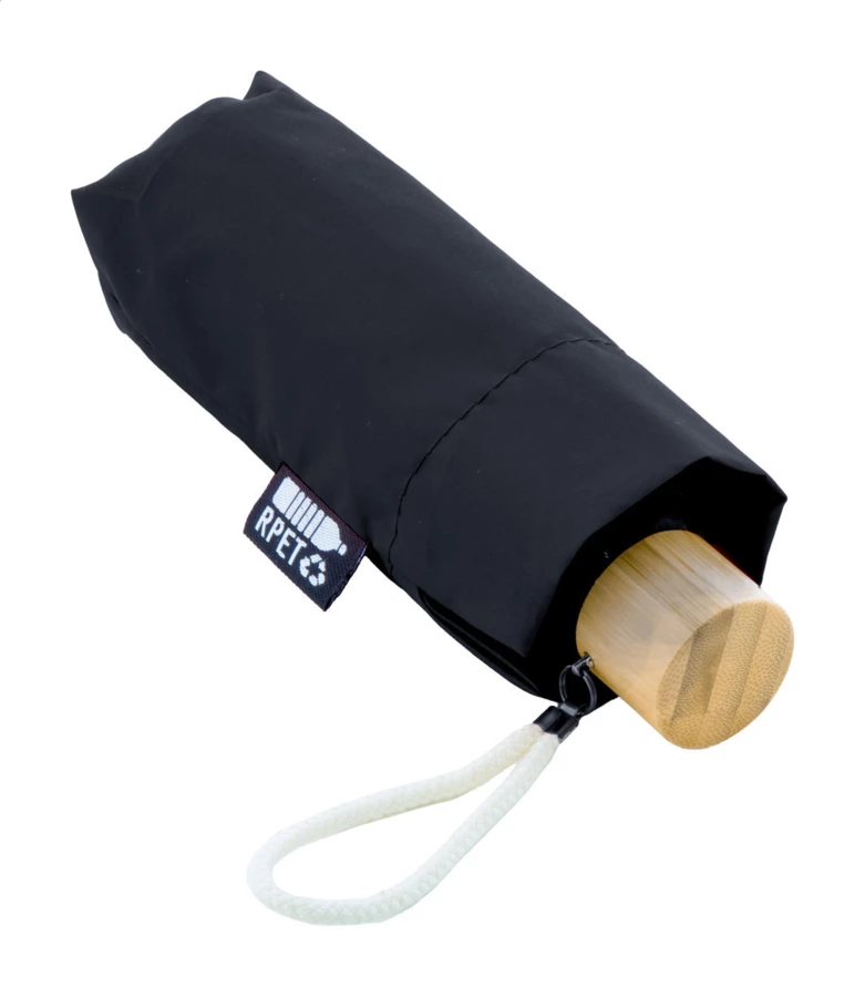Manual, windproof 3-folding mini umbrella with 6 panels in matching colour pouch. With metal frame, fibreglass ribs, bamboo handle and cotton hand strap. 190T RPET pongee, with distinctive RPET label.