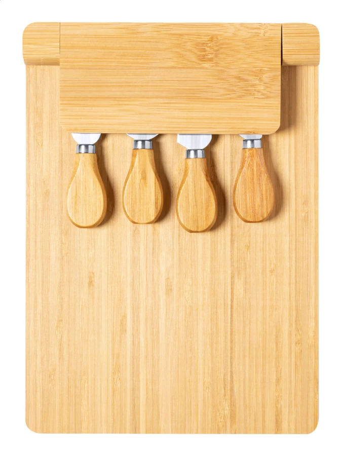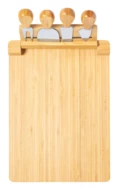 Bamboo cutting board with 4 pc stainless steel cheese knife set on foldable magnetic holder.
