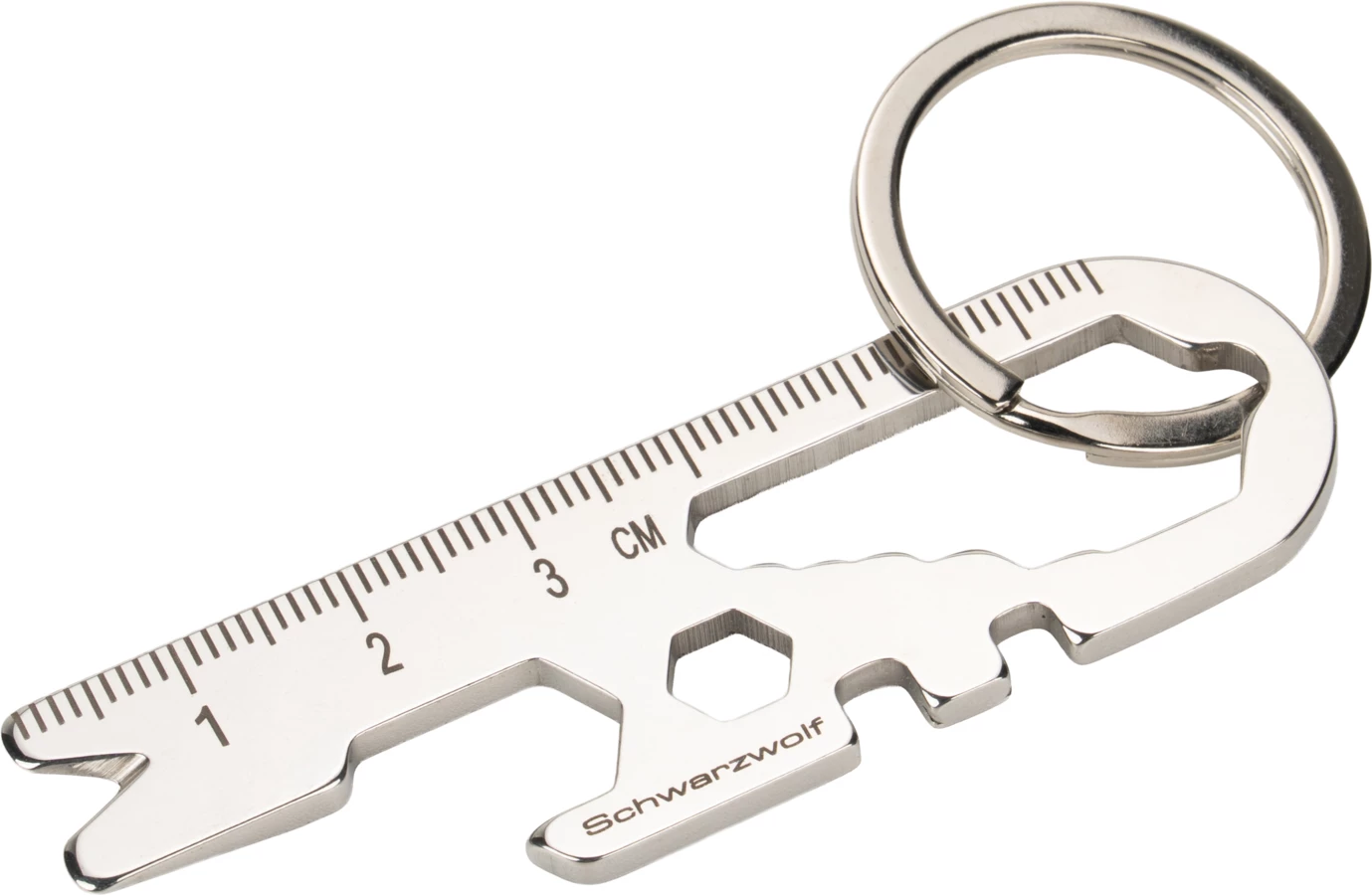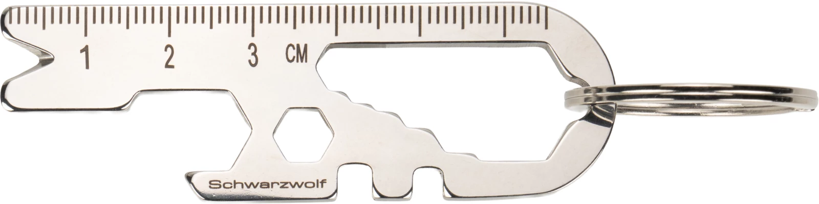 Multifunctional Schwarzwolf keychain contains 13 tools, including: a ruler, magneat, key in 6 sizes, and a bottle opener. Packed in a Schwarzwolf gift box. Material: S/S 420 steel.