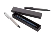 Elegant, metal twist ballpoint pen with PU leather covered barrel and black parts. In black gift box. With blue refill.