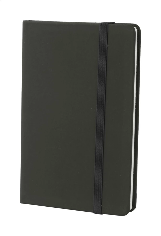 PU leather covered notebook with 100 blank sheets, bookmark and rubber strap. A6 size.