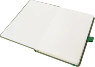 A5 notebook with a recycled cardboard cover, a bookmark, 160 dotted pages made of recycled paper and an elastic band for closure.