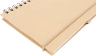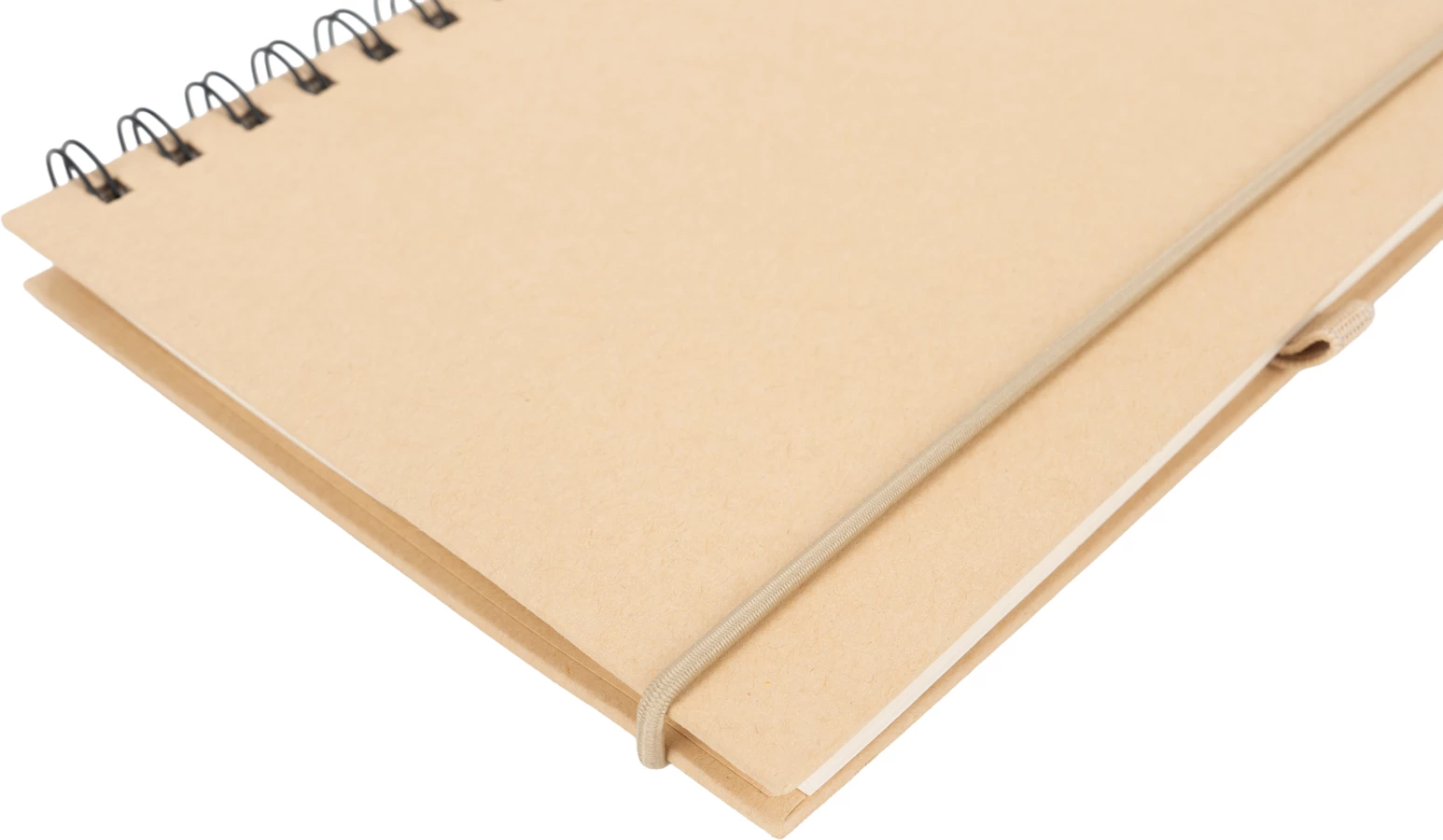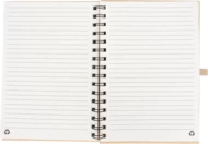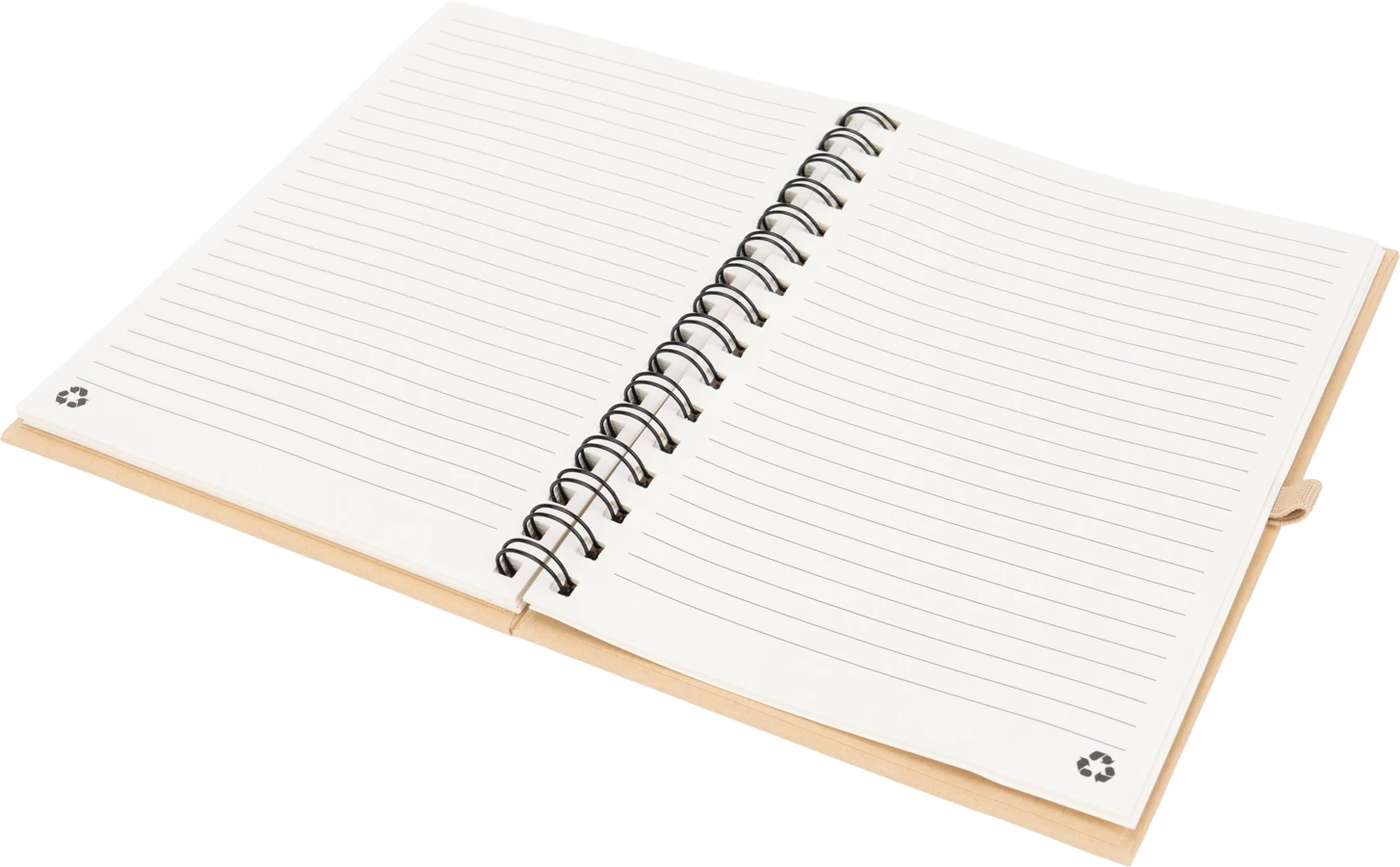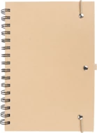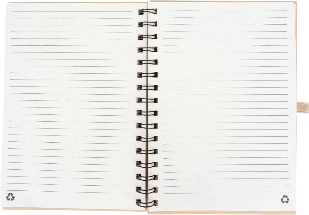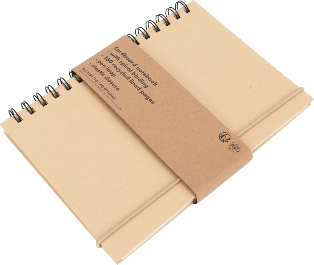 Cardboard notebook with spiral binding, 160 recycled lined pages, pen loop and elastic strap closure.
