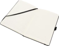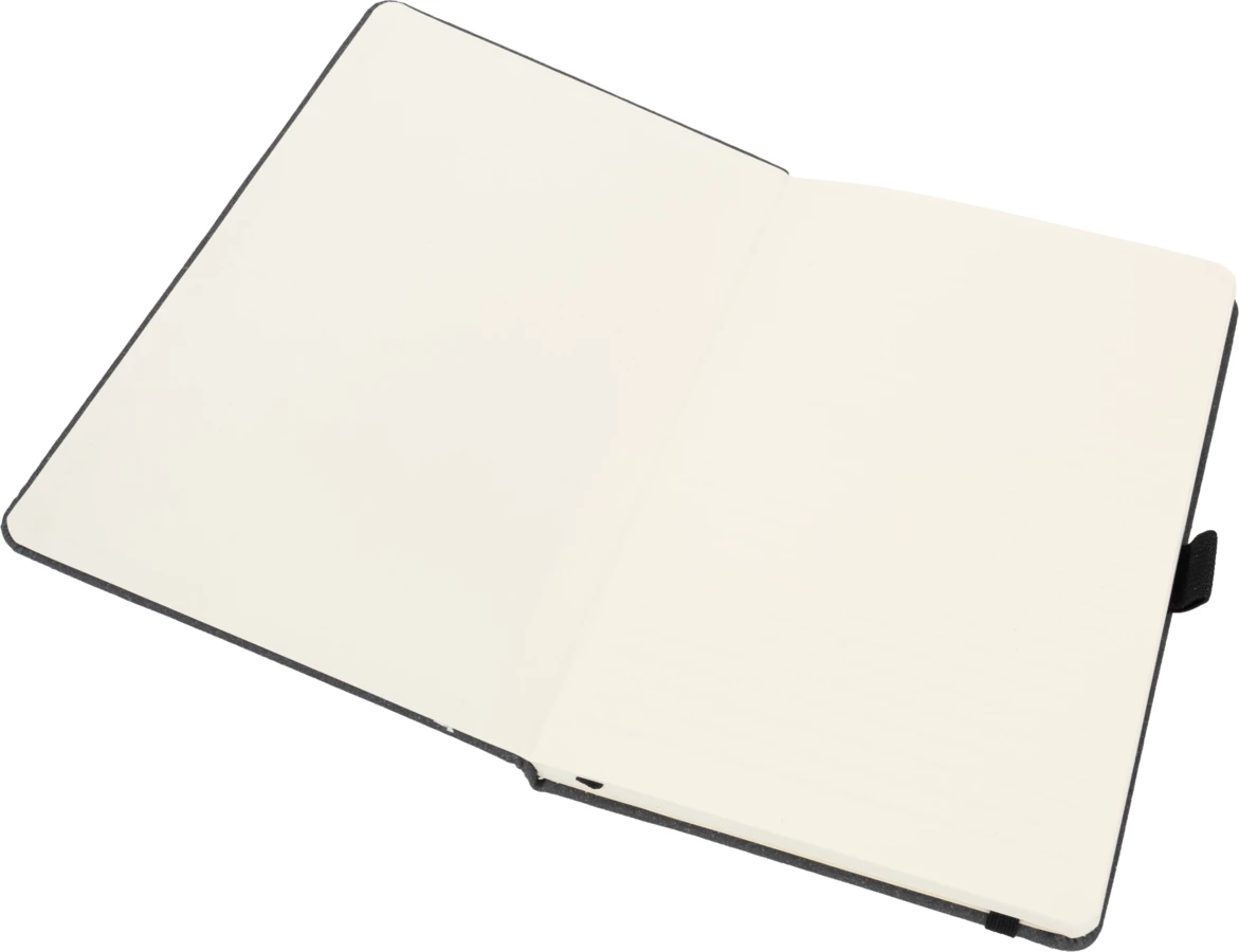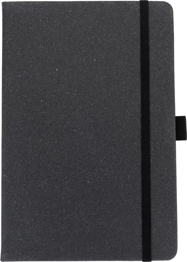A5 notebook with a cover made of recycled leather with elastic band to close, reading mark and 160 lined pages.