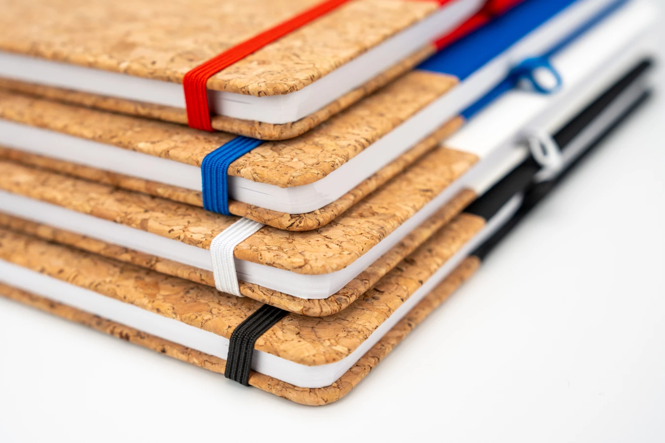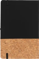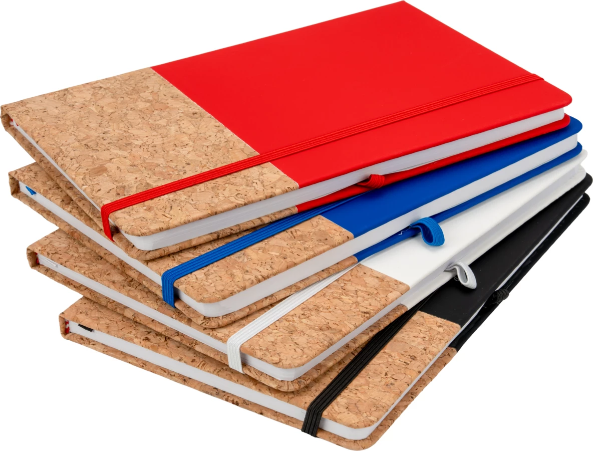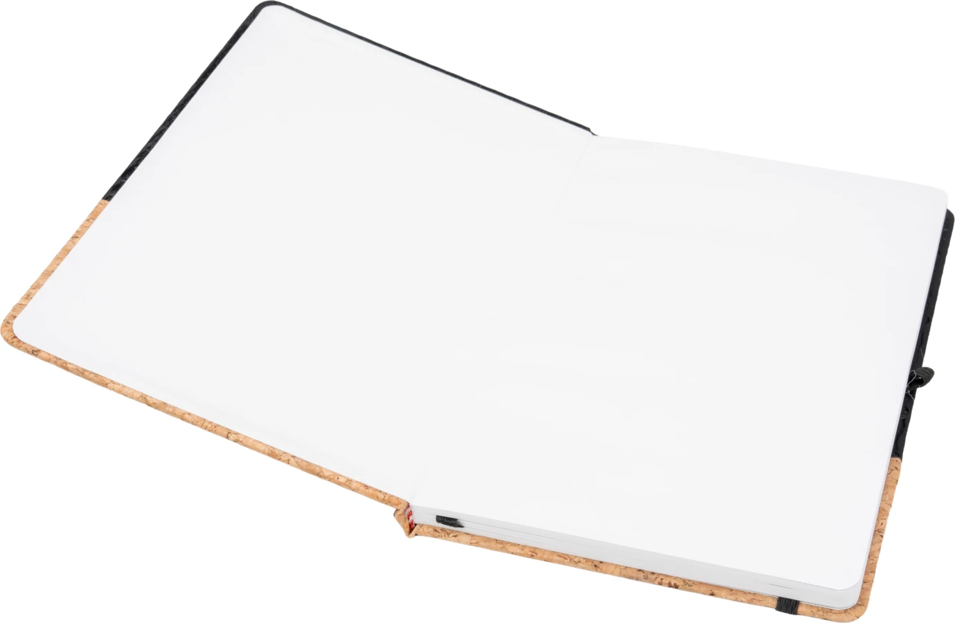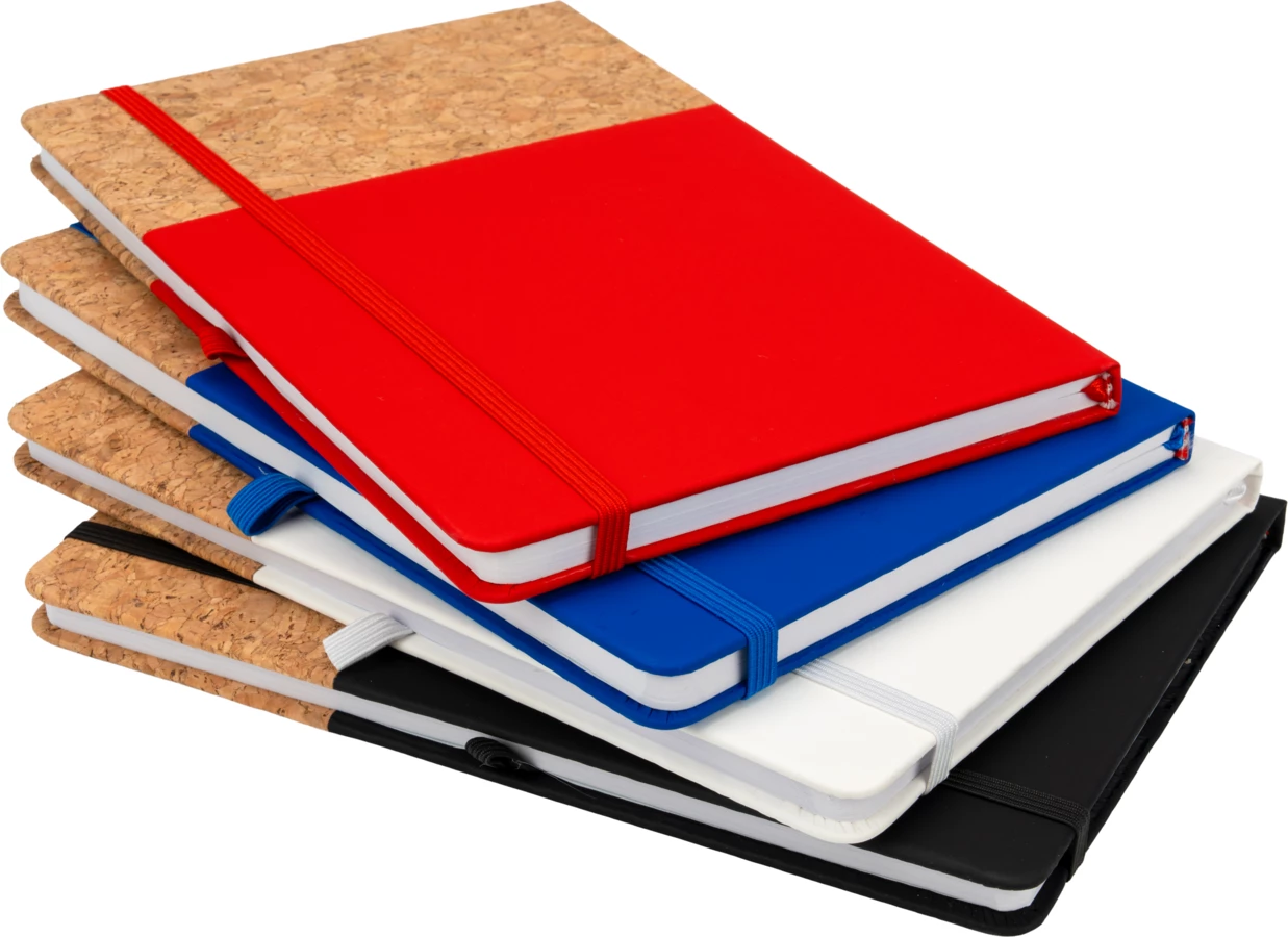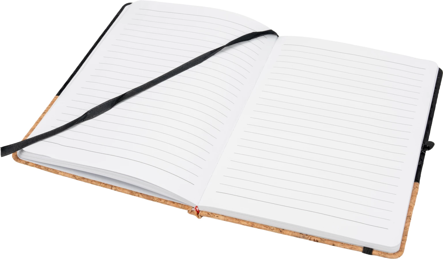 A5 notebook with 160 lined pages and PU cork cover, bookmark, ballpen loop, and elastic closure band. We print your logo on the front.