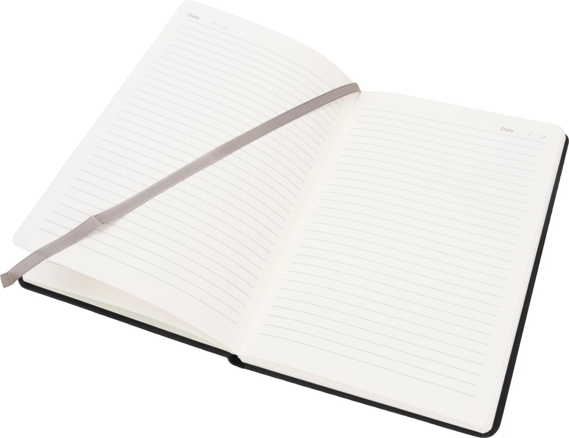 A5 Notebook with PU-Cover, 192 ruled Papers, Bookmark and an elastic band to close, including Pen Holder. Your Logo will be printed onto the Book.
