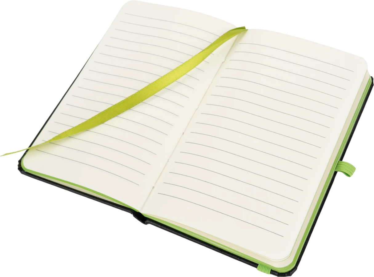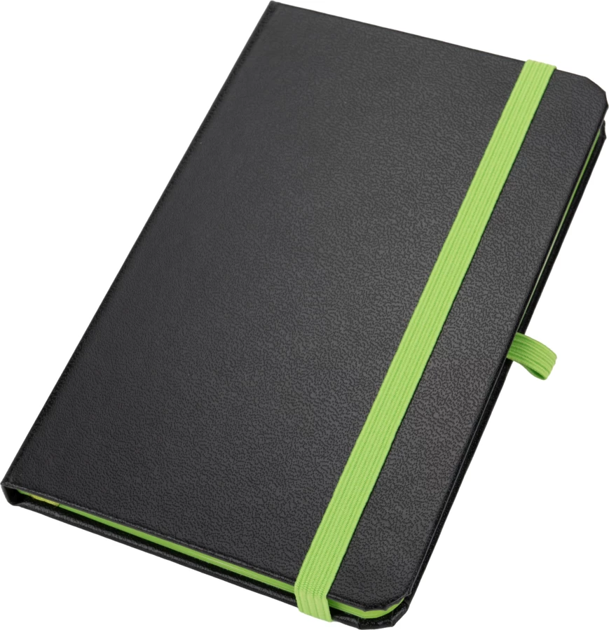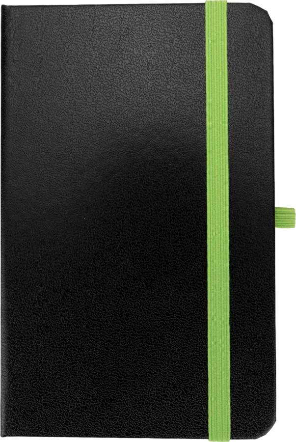 Notebook with black PU cover and 160 lined pages. Elegant look through colorful accents. We will print your logo on the cover.