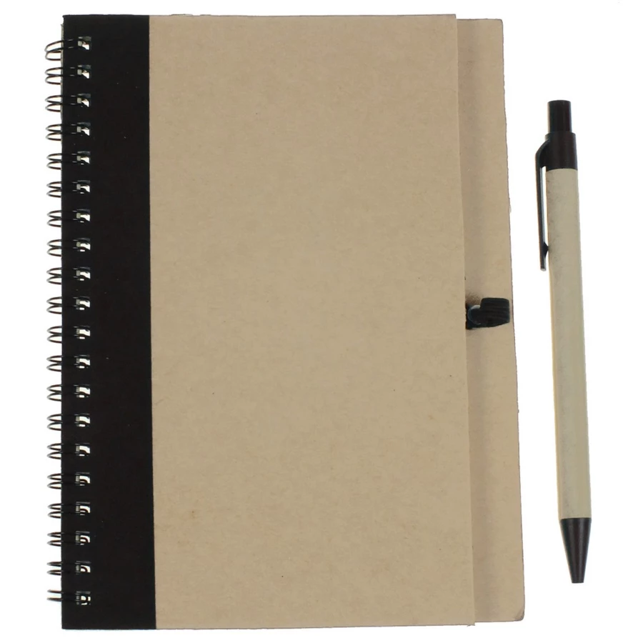 Notebook in approx. A5 size with 60 lined sheets (120 pages), features spiral binding, ball pen with coloured elements included, writes in blue, cover made of carboard with coloured detail next to the spiral binding