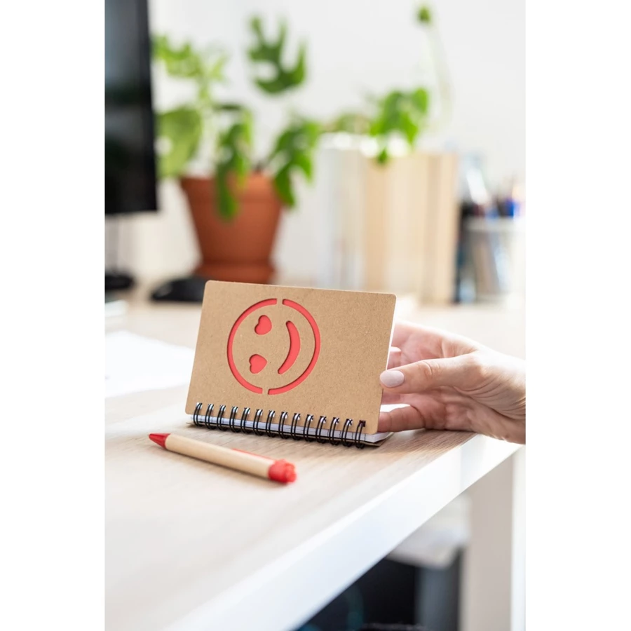 Notebook "smiling face" in approx. B7 size with 60 lined sheets (120 pages), features spiral binding, ball pen with coloured elements included, writes in blue, product made of paper and plastic