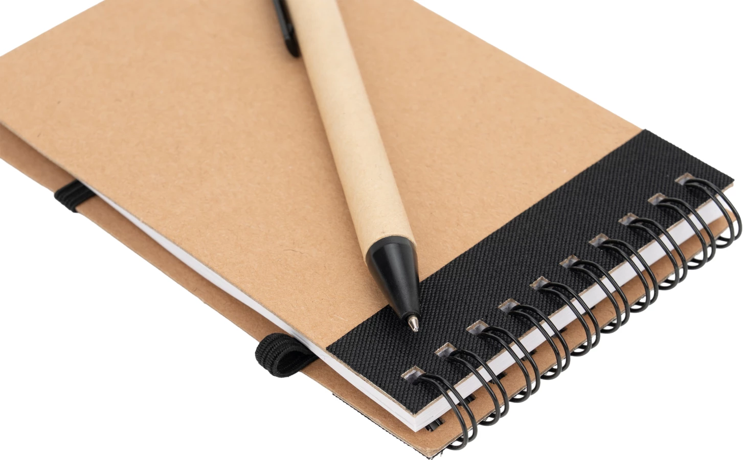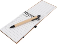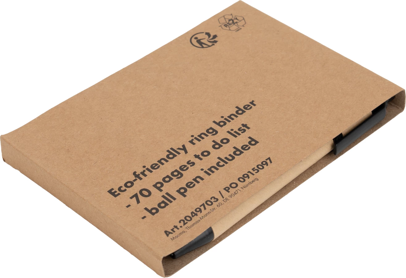 Eco-friendly ring binder with 70 pages `to do` list and ball pen. We will print your logo on the cover.