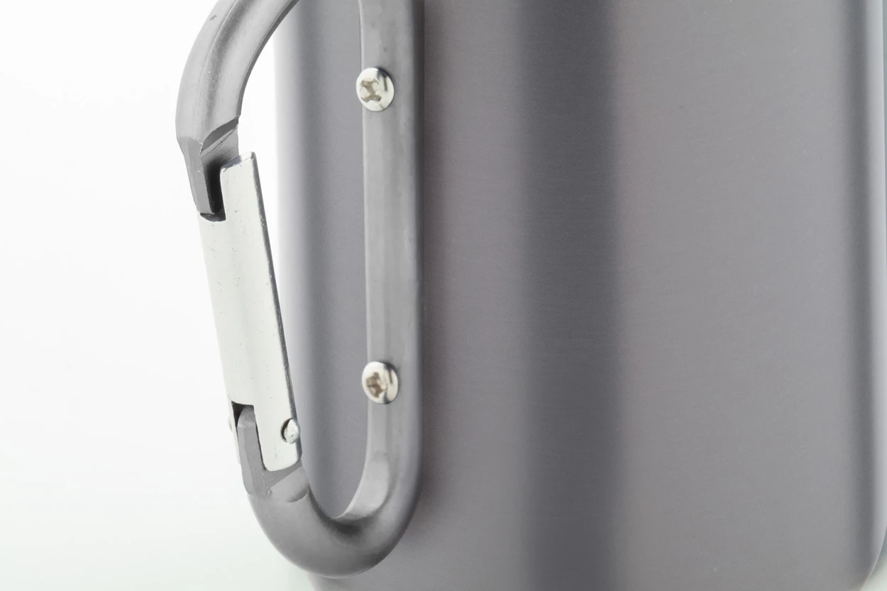 Double-wall, recycled stainless steel thermo mug with matching colour recycled aluminium carabiner handle. 300 ml. In kraft paper box.