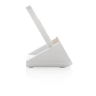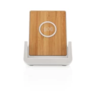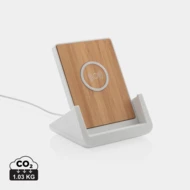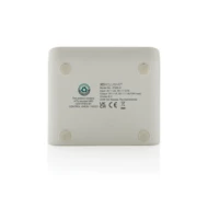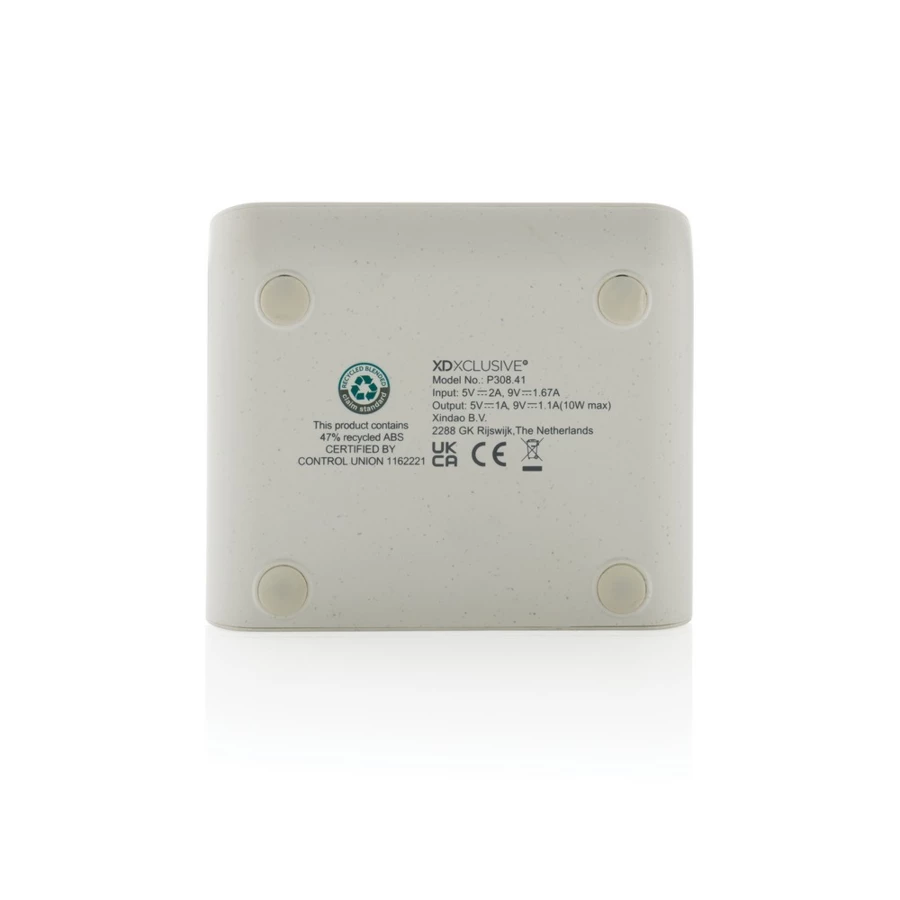 10W fast wireless charger made with RCS (Recycled Claim Standard) certified recycled ABS. Total recycled content: 47% based on total item weight. RCS certification ensures a completely certified supply chain of the recycled materials. Bamboo wireless charging area made from FSC 100 bamboo. With two USB ports on the back to charge via cable. The stand is designed to charge your phone both in the horizontal and vertical position. Making it perfect to watch videos or other content while charging. Wireless charging compatible with Android latest generations, iPhone 8 and up. Item and accessories PVC free. Including 120 cm type C charging cable made from RCS certified recycled TPE. Packed in FSC mix kraft box. Type-C Input 5V/2A; 9V/2A; Wireless output 5V/1A;9V/1.1A; (10W) Registered design®
