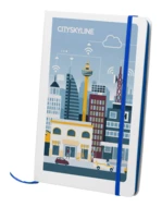 Paper covered notebook with 100 blank sheets and coloured rubber strap and matching colour side, A5.