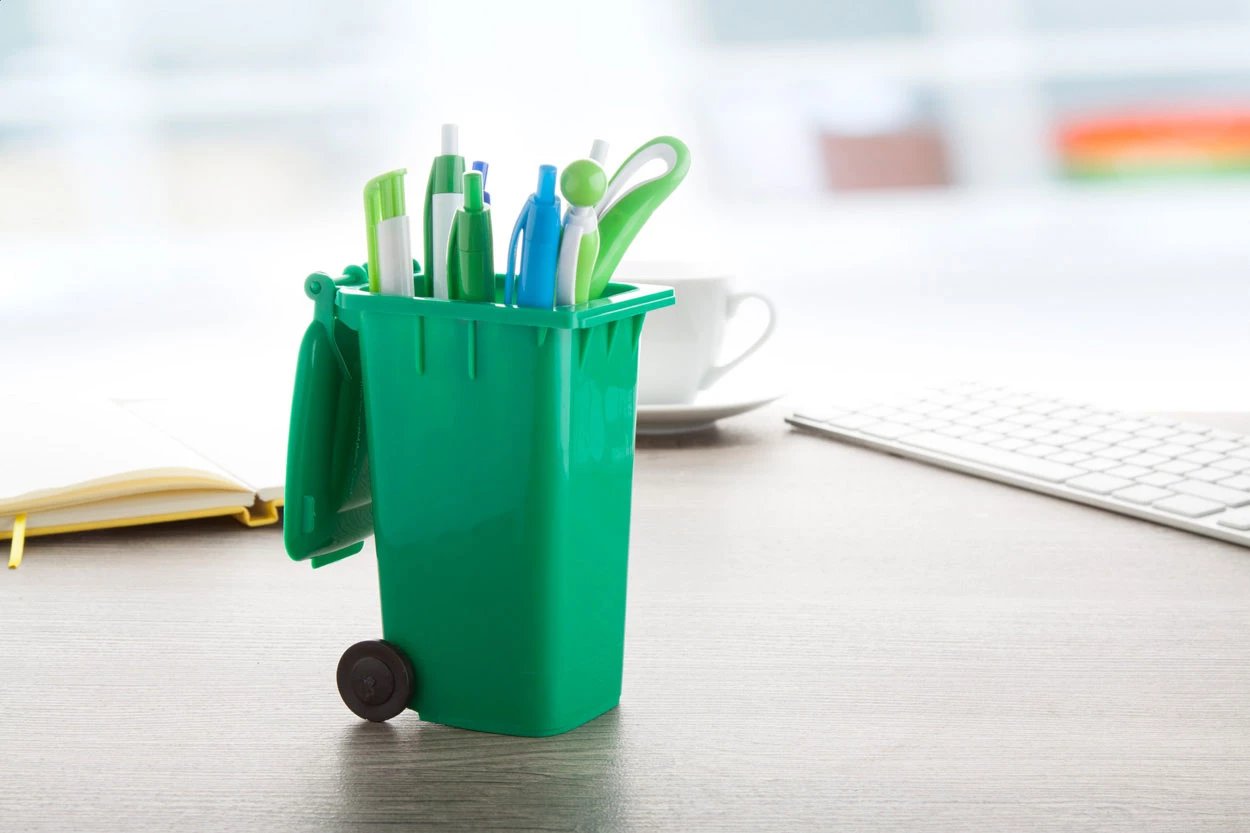 Plastic pen holder with dustbin shape.