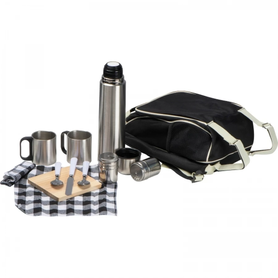 Practical picnic backpack made of sturdy polyester with integrated cooling bag, stainless steel thermal flask, 2 mugs, 2 spoons, 1 knife, salt and pepper shaker and napkin.